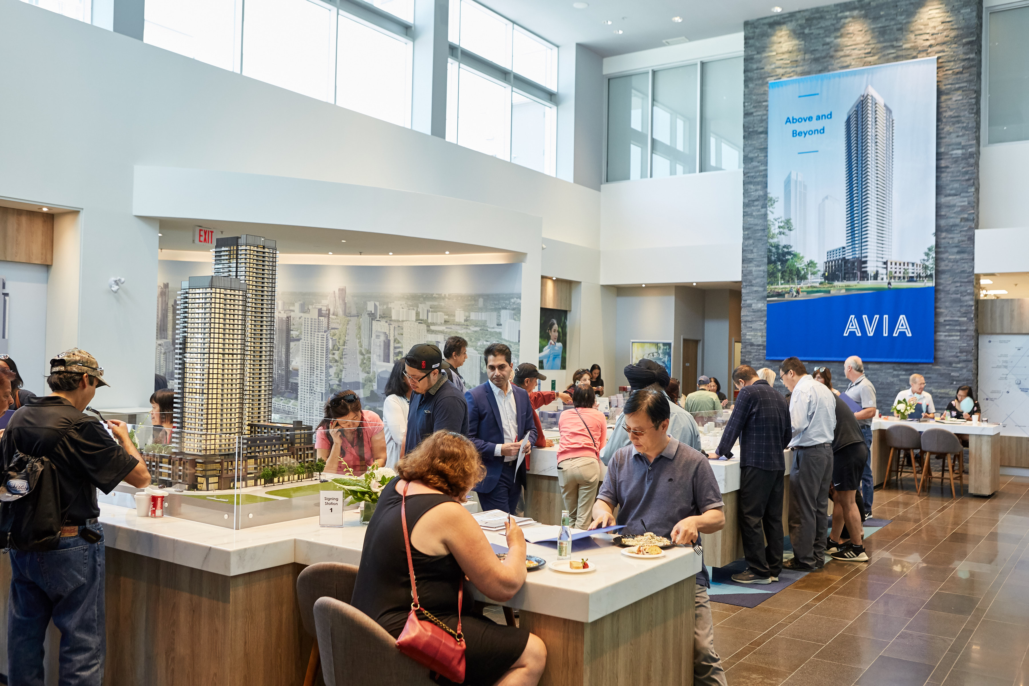 On June 22nd, Amacon hosted a blowout grand opening event for Avia at the Parkside Village Presentation Centre. Several hundred people attended and celebrated the opening of Avia, the newest addition to sought-after Parkside Village. The attendees enjoyed food, refreshments and other goodies including food stations, cotton candy and fun activities for the children and families.